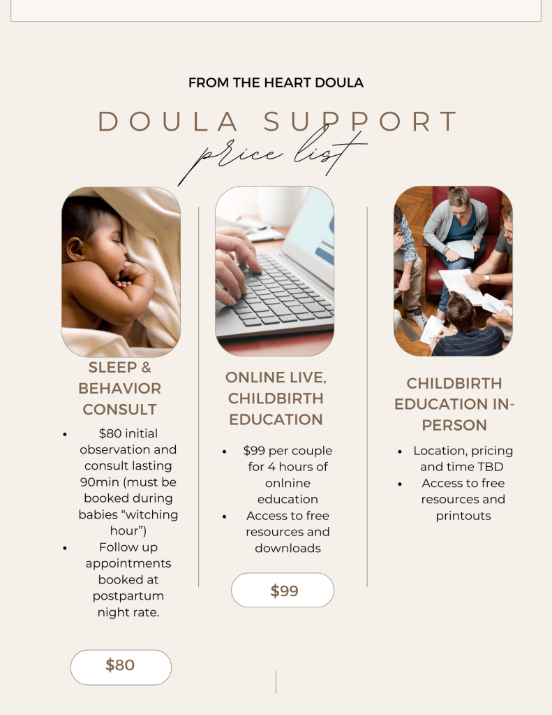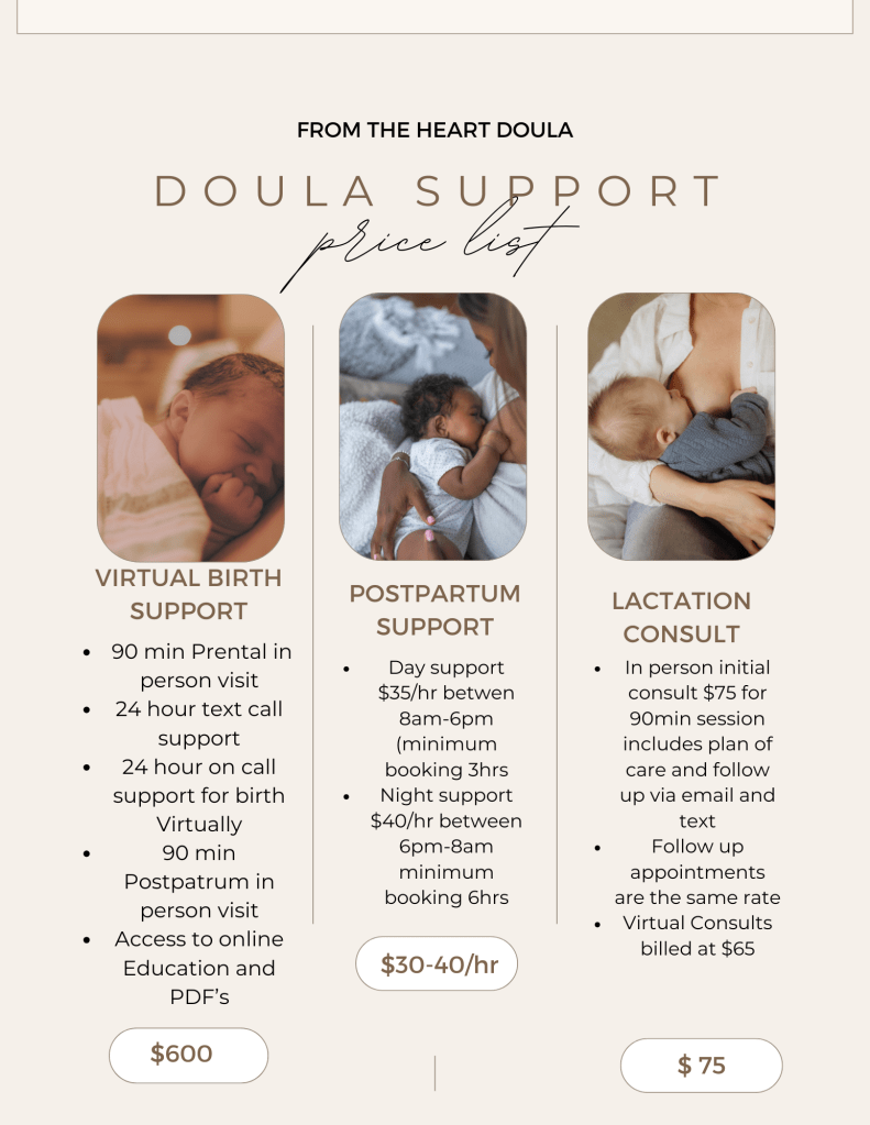 This service is designed for those who do not want or find that doula services are outside their budget and are looking for education, advice and resources. This is online over zoom consulting only. Prices are based on time desired to speak with the doula. Please email tiamiddleton.doula@gmail.com for inquiries. Please be prepared to fill out a quick service survey about the topics you wish to discuss.